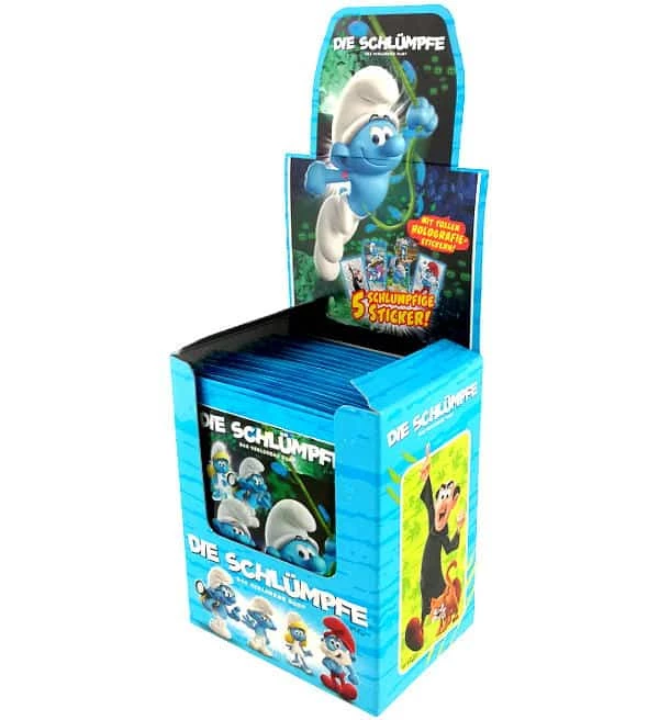 Display mit 50 Tüten aus der “Die Schlümpfe Das verlorene Dorf” Sticker-Kollektion von Blue Ocean. Jede Tüte enthält 5 Sammelbilder.