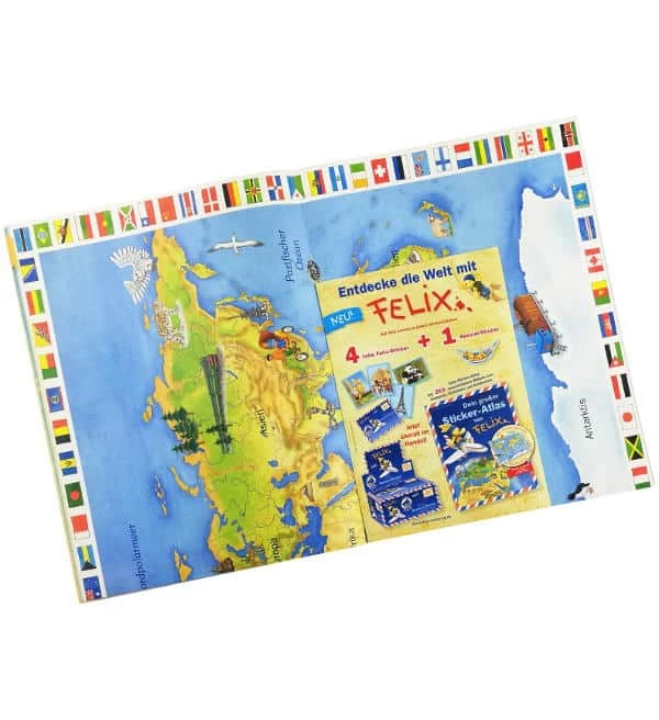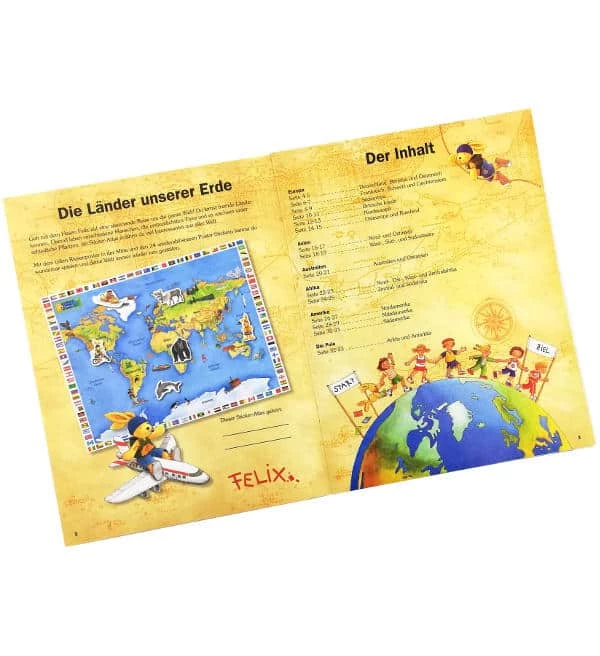 Sammelalbum zur Kollektion “Felix Sticker-Atlas: Sticker aus aller Welt” von Blue Ocean mit 36 Seiten für insgesamt 216 verschiedene Motive, davon 168 rechteckige-, 24 formgestanzte und 24 wieder ablösbare Sticker.