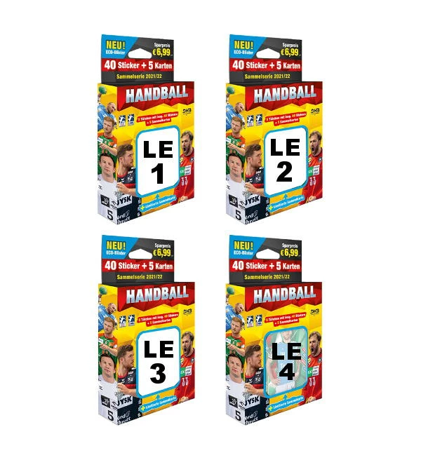 Alle 4 Eco-Blister aus der “Handball Bundesliga 2021/22 Sticker + Cards” Kollektion von Blue Ocean und Victus. Jeder Eco-Blister enthält 5 Tüten + 1 Limited Edition Card.