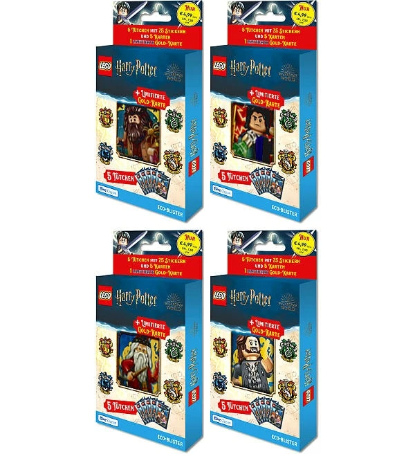 Alle 4 verschiedenen Eco-Blister aus der Sticker- & Cards-Kollektion “LEGO Harry Potter (2023)” von Blue Ocean mit insgesamt 20 Tüten (=100 Sticker + 20 Karten) plus diese 4 exklusiven Parallel-Karten: