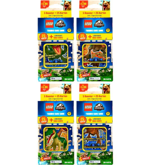 Alle 4 verschiedenen Lego Jurassic World Serie 2 Blister. Insgesamt erhalten Sie 20 Tüten (=100 Lego Jurassic World Karten) plus diese 4 verschiedenen limitierten Karten: