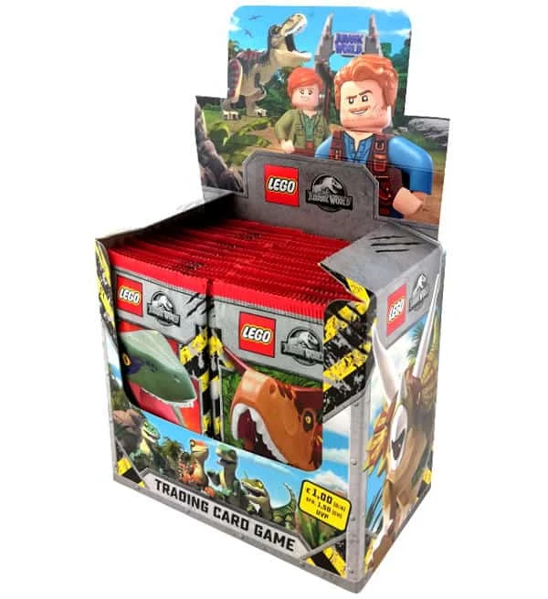 Display mit 50 Tüten des Lego Jurassic World Trading Card Game “Die Insel”. Jede Tüte enthält 5 Karten, somit sind in der Box insgesamt 250 Lego Jurassic World Cards.
