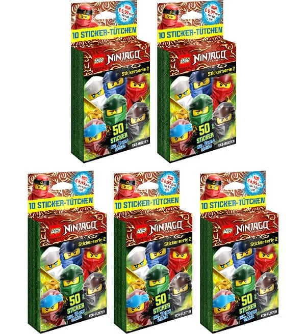 5 Blister mit insgesamt 50 Tüten (=250 Sticker) aus der “Blue Ocean LEGO Ninjago Legacy Serie 2” Sticker-Kollektion.