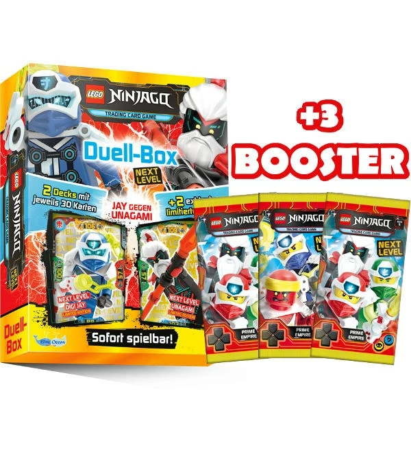 Die exklusive Lego Ninjago Serie 5 NEXT LEVEL Trading Cards Duell Deck Box “Jay gegen Unagami” + 3 Gratis-Booster mit folgendem Inhalt: