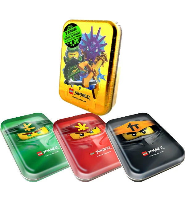 Tin Giga Set aus der LEGO® NINJAGO® Serie 7 Sammelkarten Serie bestehend aus “MIDI-Tin”, sowie den Mini-Tins “Grün”, “Rot” und “Schwarz”. Das Tin Mega Set zum Lego Ninjago Serie 7 Trading Card Game beinhaltet insgesamt: