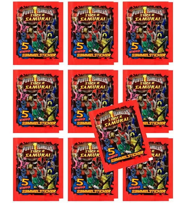 10 Tüten aus der “Power Rangers Super Samurai” Sticker-Kollektion. Jede Tüte enthält 5 Sammelbilder.