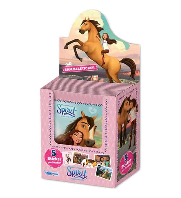 Ein Display aus der Spirit Wild und Frei Sticker-Kollektion von Blue Ocean mit 36 Tüten. Jede Tüte enthält 5 Sammelbilder.